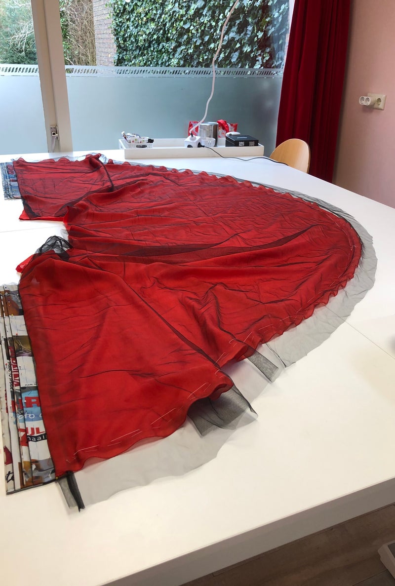 De onderkant van de jas is een halve cirkel, uiteindelijk had ik 5 lagen van verschillende stoffen in de cirkel verwerkt.