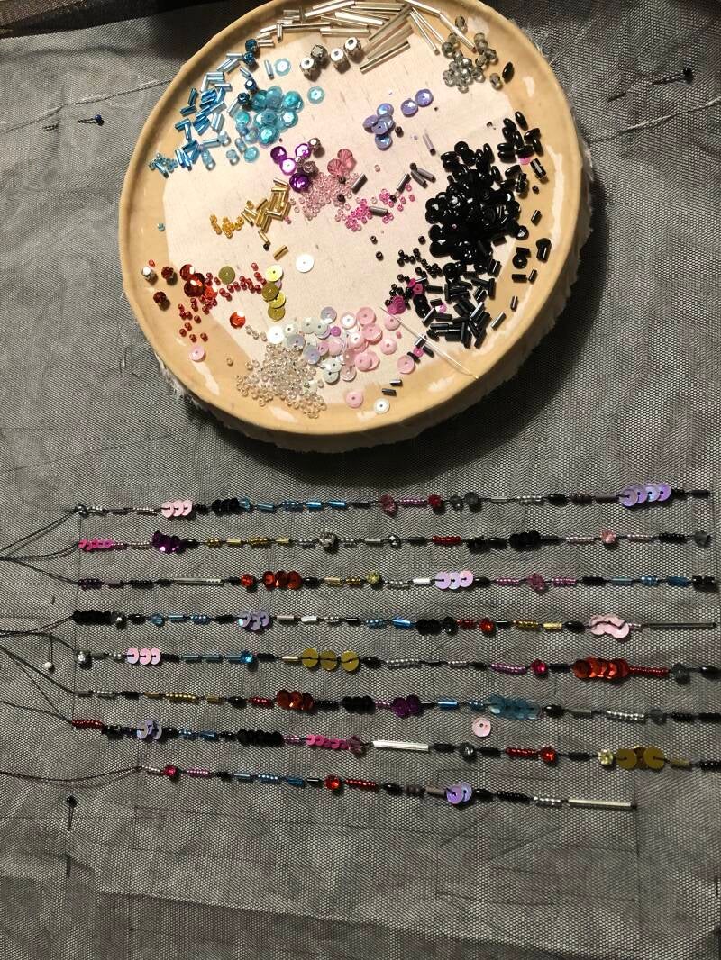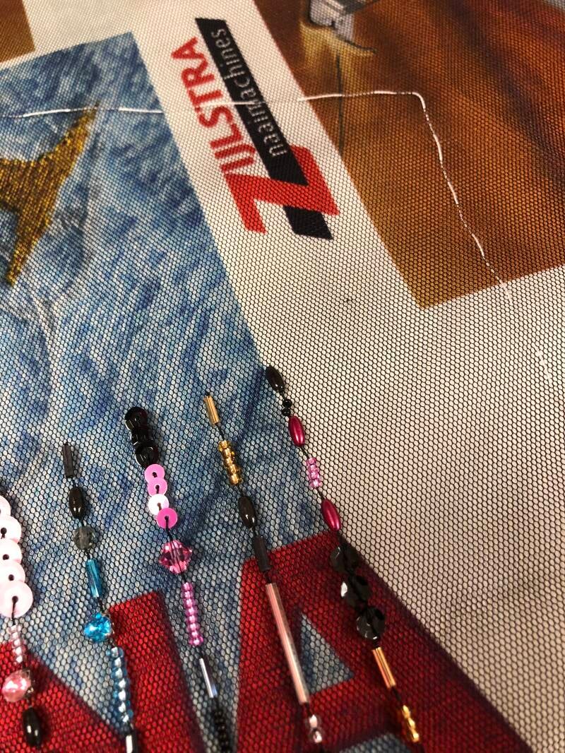Om het borduren mogelijk te maken had ik een tule stof gebruikt die over de stoffen heen is gelegd.