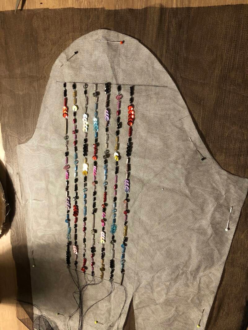 De kralen zitten op de linker mouw, op het achterpand en aan de voorkant van de jas.