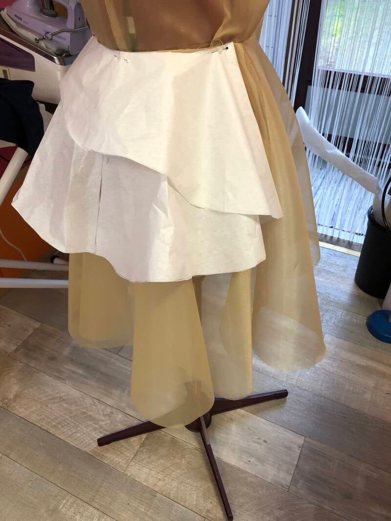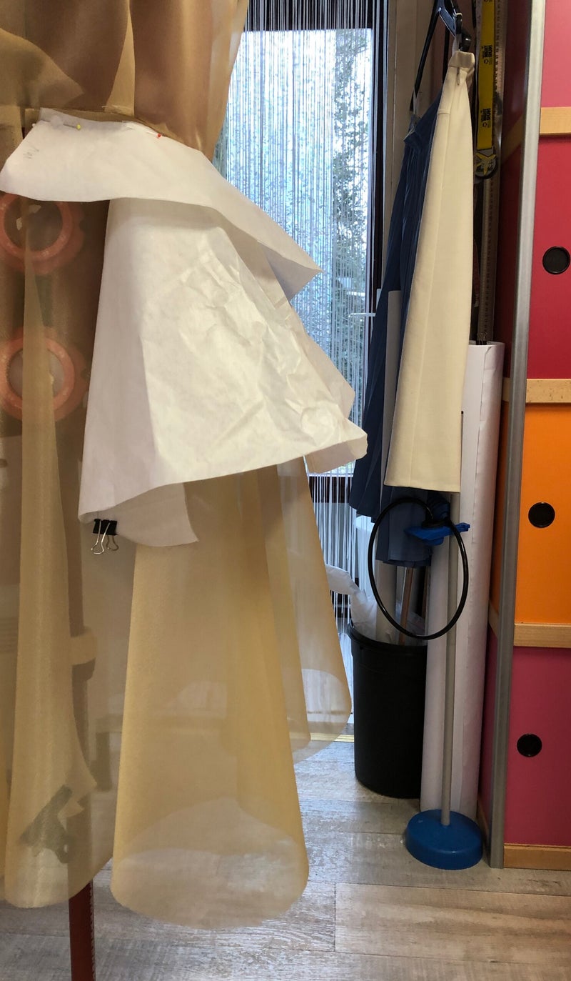 Van papier en een synthetische chiffon heb ik een proefmodel gemaakt. Zo kun je goed zien hoe het model eruit komt te zien en kun je de pasvorm controleren en aanpassen.